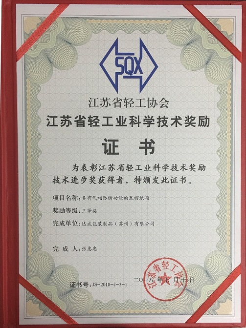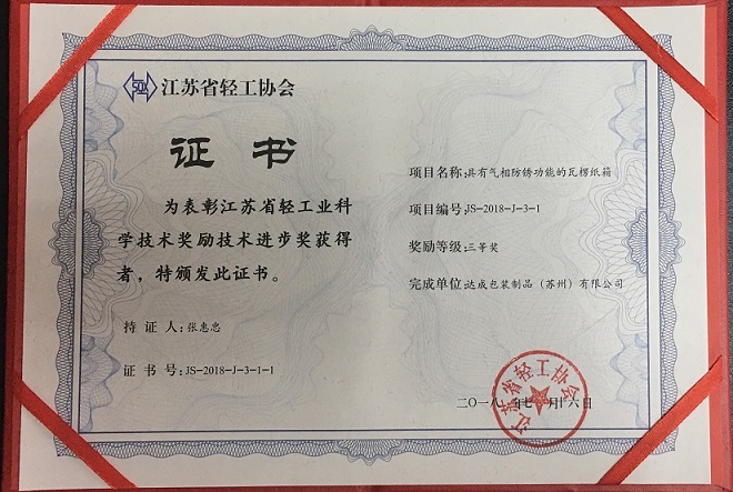 公司的产品“具有气相防锈功能的瓦楞纸箱”获得江苏省轻工协会颁发的“江苏省轻工业科学技术奖励技术进步奖”三等奖,证书号