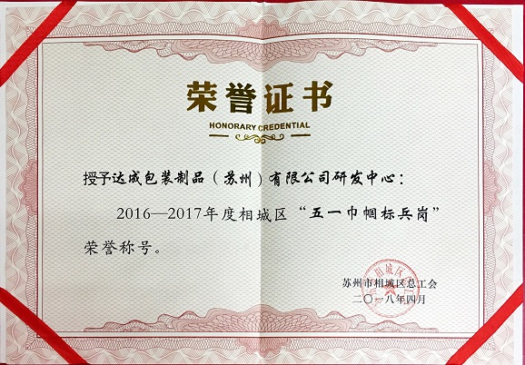 达成包装公司研发中心获得苏州市相城区总工会授予的
