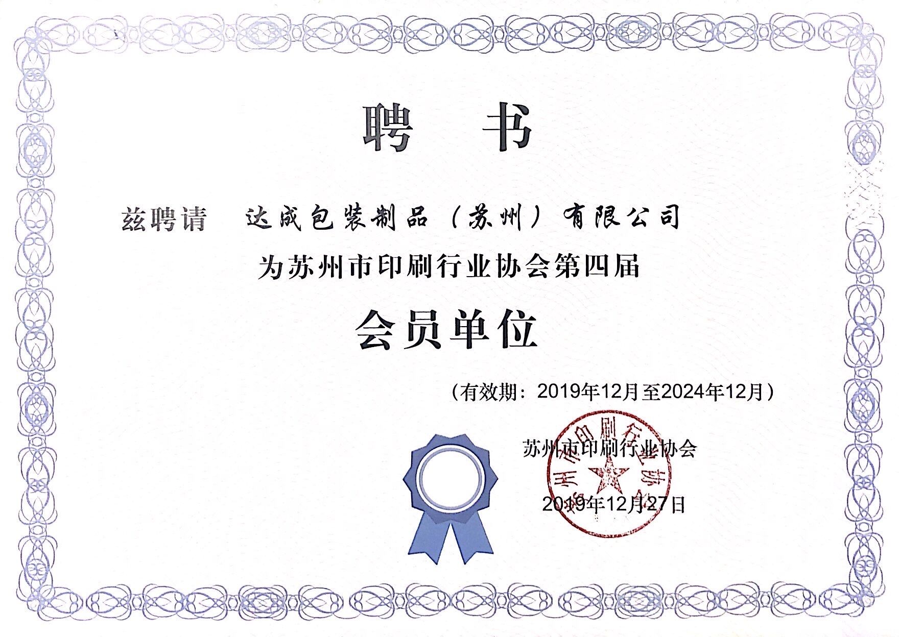2019年12月,公司被聘请为苏州市印刷行业协会第四届会员单位。